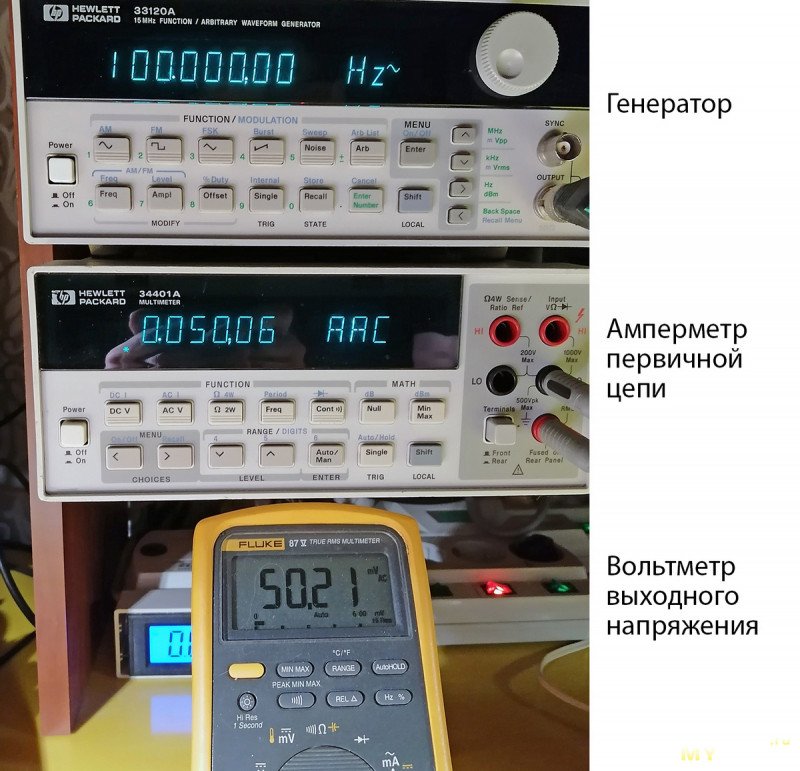 Для тестирования модуля применены генератор сигналов различной формы в качестве источника тока, и цифровой «true rms» амперметр для контроля силы переменного тока в первичной цепи. А также цифровой милливольтметр «true rms» и осциллограф на выходе платы. Генератор сигналов обеспечивает выходное напряжение до нескольких вольт RMS на нагрузке 50 Ом. И это напряжение было подобрано так, чтобы сила тока составила 50 мА.