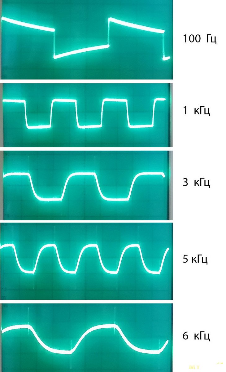 На входе ток прямоугольной формы, меандр. Ниже осциллограммы выходного напряжения модуля на различных частотах: