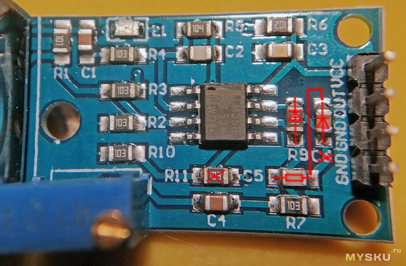 На плате разрезаем дорожку между конденсаторами C5 и C6. И ставим одну проводную перемычку между освободившимся выводом C5, и выходом модуля.