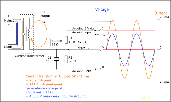 Я исп. такую схему подключения трансформатора тока к MK