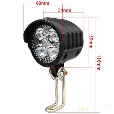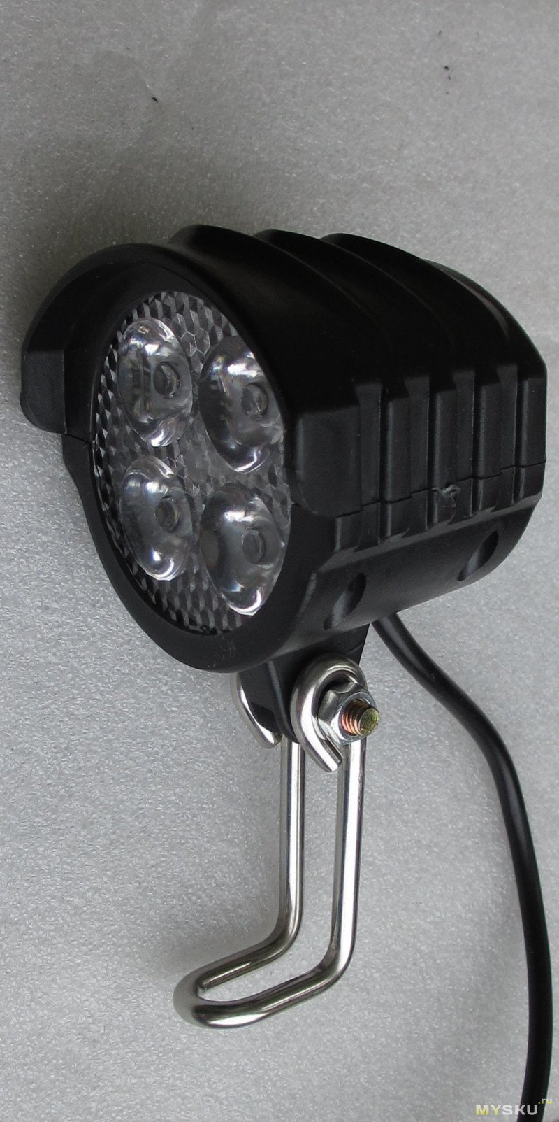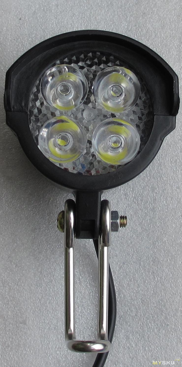 Фара — сплошной пластик, не считая крепления, впрочем иного и не обещали.Заявлено питание от 36-48В, про мощность ни слова, у лота на удивление честное описание и характеристики, разве что про ipx6 явно приврали.