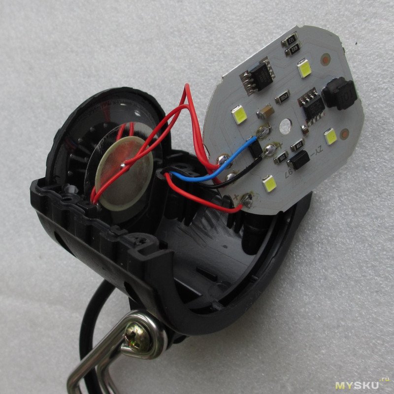 Вся электроника собрана на alpcb толщиной 0.8мм, для фары есть зашита от переполюсовки на 1n4007, а вот для гуделки — ничего такого не видно: