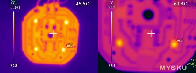 Вне корпуса нагрев светодиодов ~90C, драйвера 70C при 30C окружающей среды.