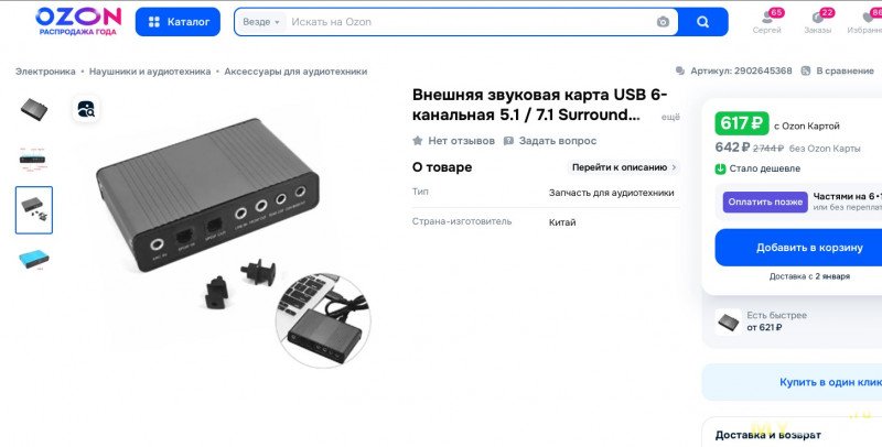 Прикупил на алиэкспрессе внешнюю звуковую карту. Была мысль сделать из своей акустики 2 + сабвуфер.