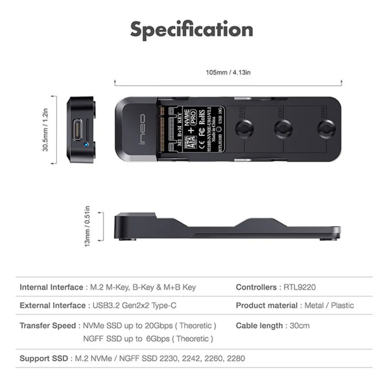 Ранее, у меня на обзорах уже были аналогичные боксы, но то были модели с поддержкой скорости до 10Гбит/c. Здесь же имеем в два раза более быстрый вариант, плюс интересный алюминиевый корпус, намекающий на хорошее охлаждение SSD, работающего в нём.