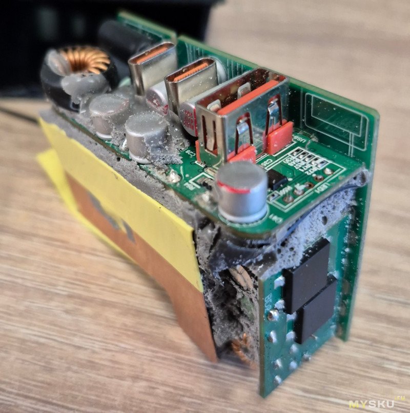 У Автора недостаточно технической части по внутреннему строению блоков питания и устройств на основе технологии GaN, однако, возможность и любопытство разобрать его имеется, что позволит более квалифицированным специалистам определить качество изготовления и теоретически причину неисправности для будущих владельцев.Корпус разбирается дремелем со специальной насадкой по пластику.