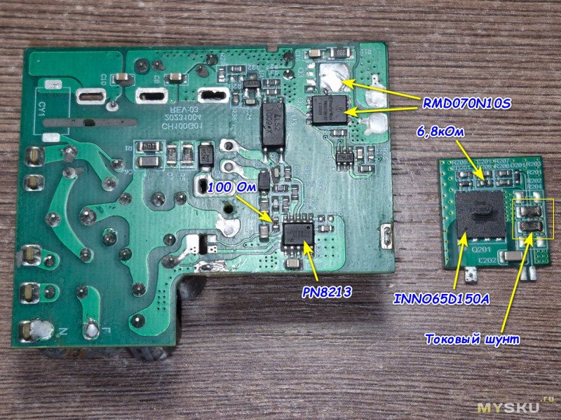Токовые резисторы подбирал так. Нашёл в Интернете схему зарядки на своём драйвере. Кстати драйвер U201 у меня стоял PN8213. Я его купить не смог, нет нигде. Но благодаря комментариям к Отчёту я выяснил, что на аналогичных зарядках стоят драйверы NCP1342 и FM2842. Себе поставил FM2842, т.к. срок поставки был меньше и цена тоже. Так вот на схеме зарядки с драйвером PN8213 токовые резисторы стояли 4 шт. по 1 Ом, что в итоге 0,25 Ом. Т.к. зарядка на найденной схеме 65 Вт, а моя на 100 Вт, пропорционально уменьшил общее сопротивление двух токовых резисторов. Поставил два по 0,33 Ом, в сумме 0,165 Ом. Этого оказалось недостаточно, т.к. блок при включении паяльника уходил в защиту. Уменьшил ещё сопротивление добавив резистор на 1 Ом, который у меня был и общее сопротивление стало 0,142 Ома. Блок перестал уходить в защиту. По поводу R209 на снимке в Отчёте хорошо видна его маркировка на 6,8 кОм. Обвязку транзистора и драйвера нужно обязательно проверить. У меня на затворе стабилизатор ZD201навернулся, а в обвязке драйвера резистор R33.