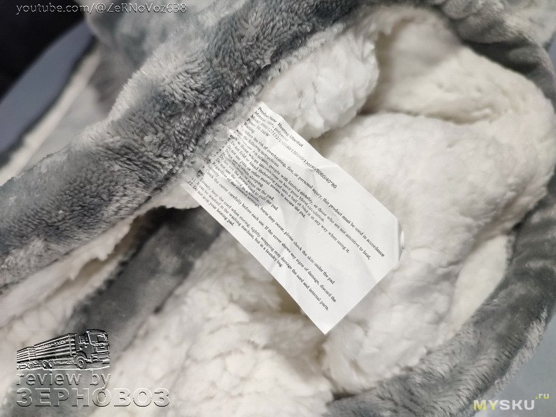 Снаружи светло-серый плюш, внутри белая «овечка». За нагрев отвечают двойные нагревательные жилы, 6 уровней температуры, таймер до 10 часов, защита от перегрева и съёмный коннектор под стирку. Управление простое: кнопка включения и две пары «плюс-минус» для нагрева и таймера.