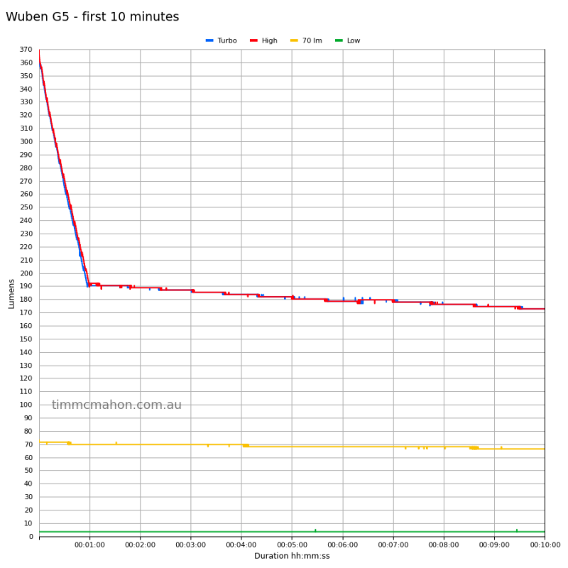 В максимальном режиме сразу же срабатывает плавный степдаун и через минуту яркость снижается до уровня выше среднего. При этом прекращается и нагрев, так что возможно электроника опирается на температуру, а не просто сбрасывает мощность по таймеру. Теплоотвод из-за формы корпуса не очень хороший, но голова нагрелась только до 45.5°C в пике.