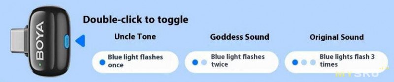 Внимание: при выборе режимов — они активируются одновременно для для двух микрофонов и отображаются в виде световой индикации (горит/мигает зелёный или синий светодиод)