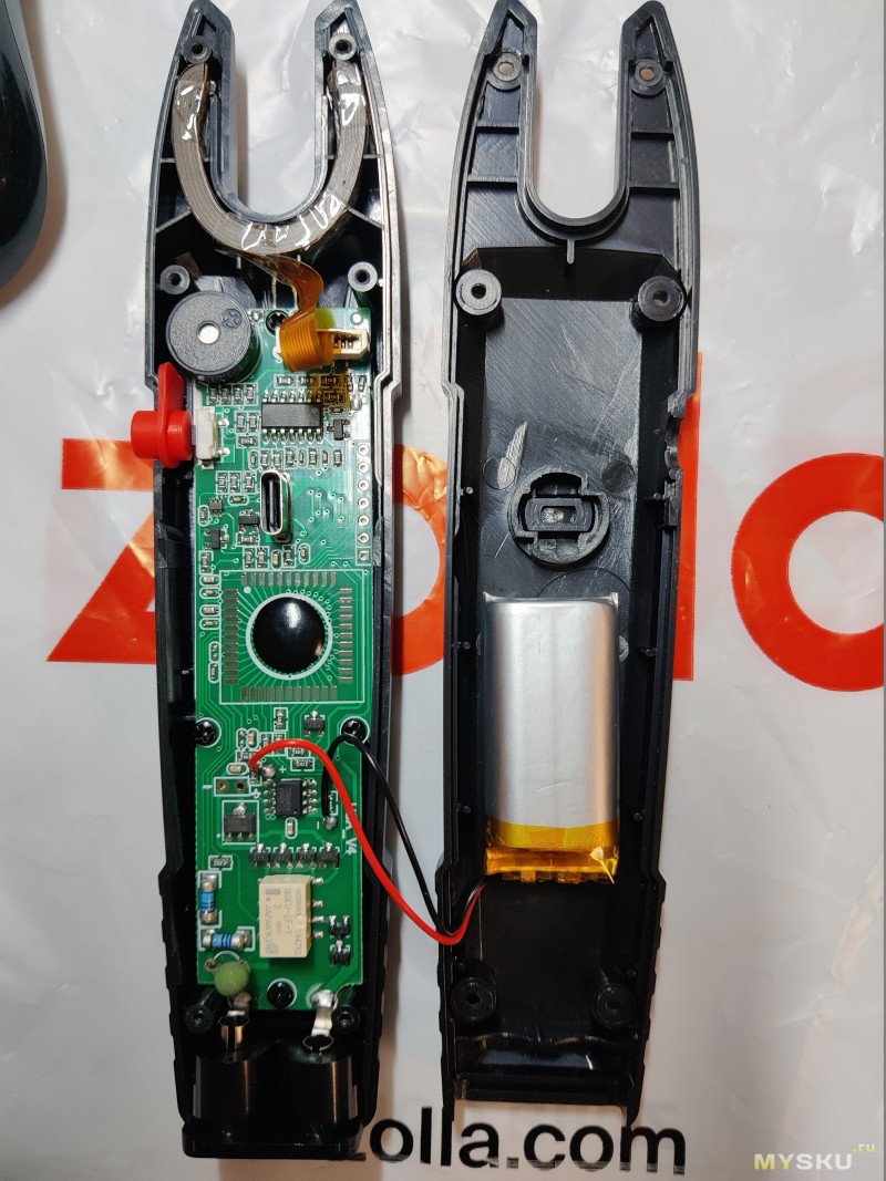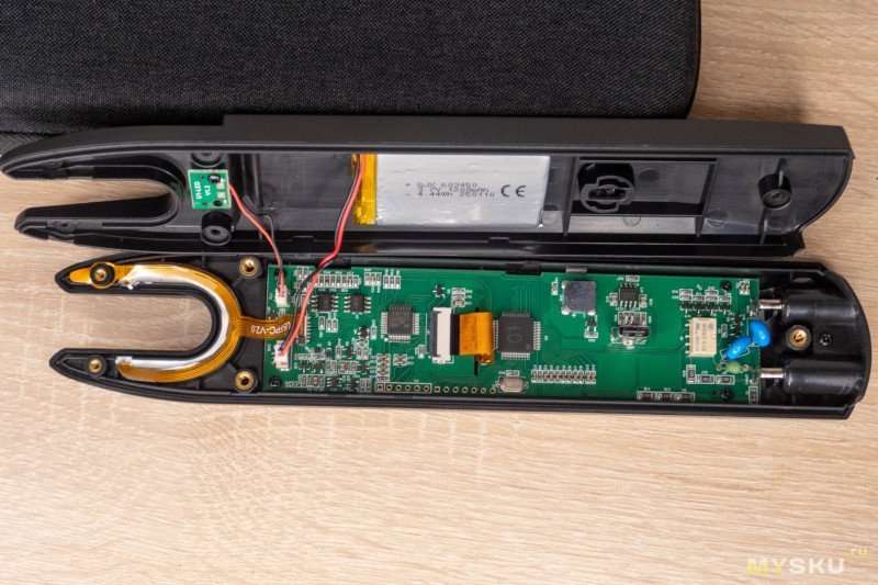 Внутри губок находится шлейф с несколькими контурами. Снизу он залит герметиком, так что не понятно куда уходят концы. В левом «ушке» есть дополнительный участок для бесконтактного обнаружения напряженности.