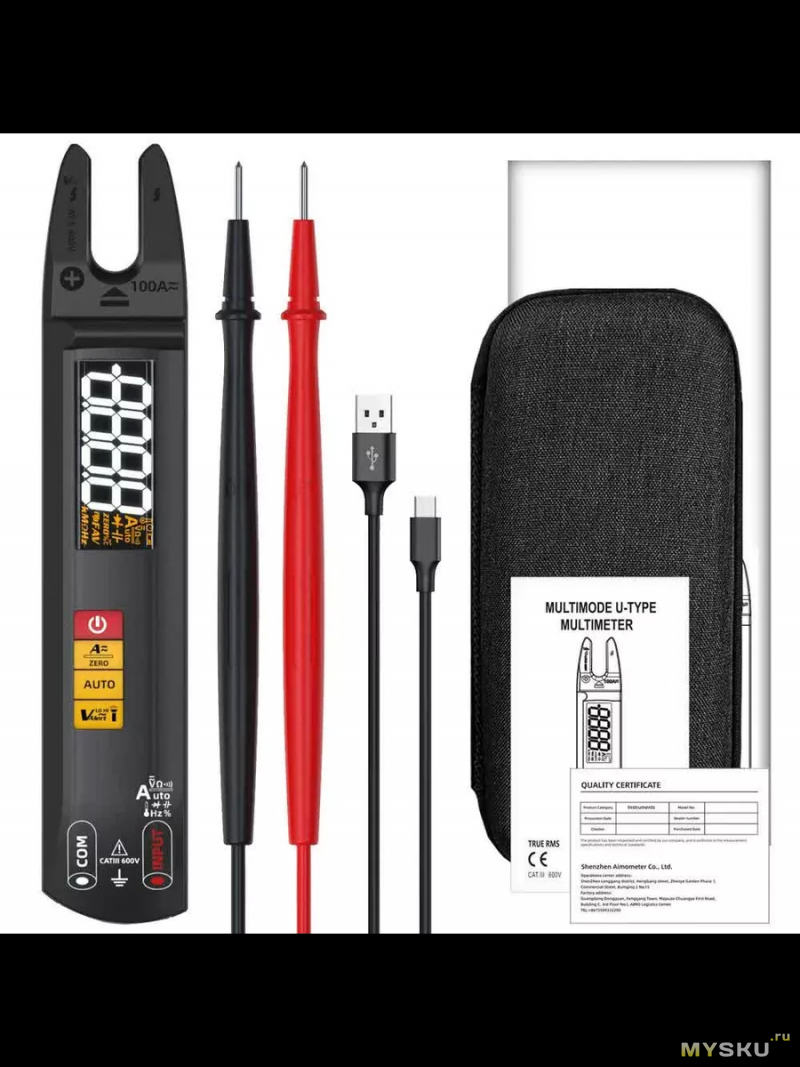 В комплекте клещи-мультиметр, пара стандартных щупов, шнур Type-C для зарядки и инструкция.
