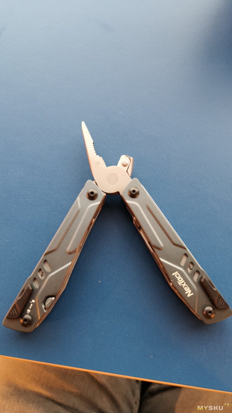 Корпуса рукояток собраны из выштампованых стальных пластин с декоративными алюминиевыми накладками. Основной функционал: разводной ключ, нож, пассатижи + круглогубцы + кусачки, пилка по дереву, напильник.