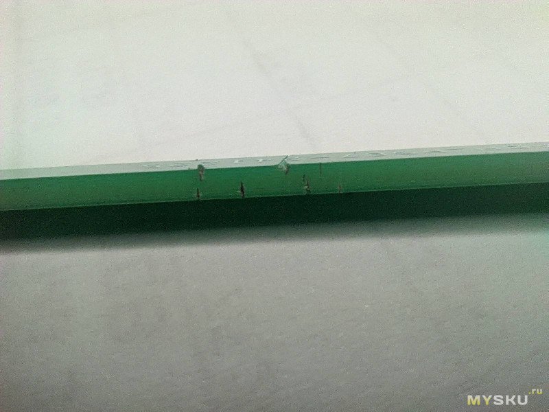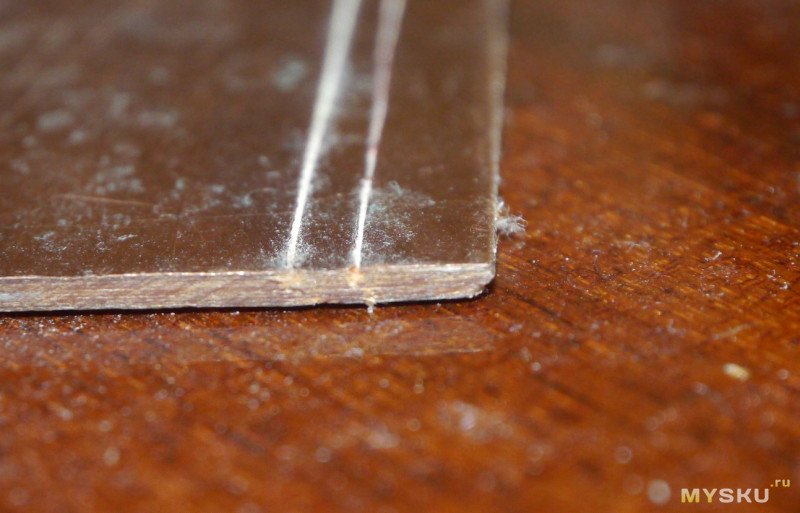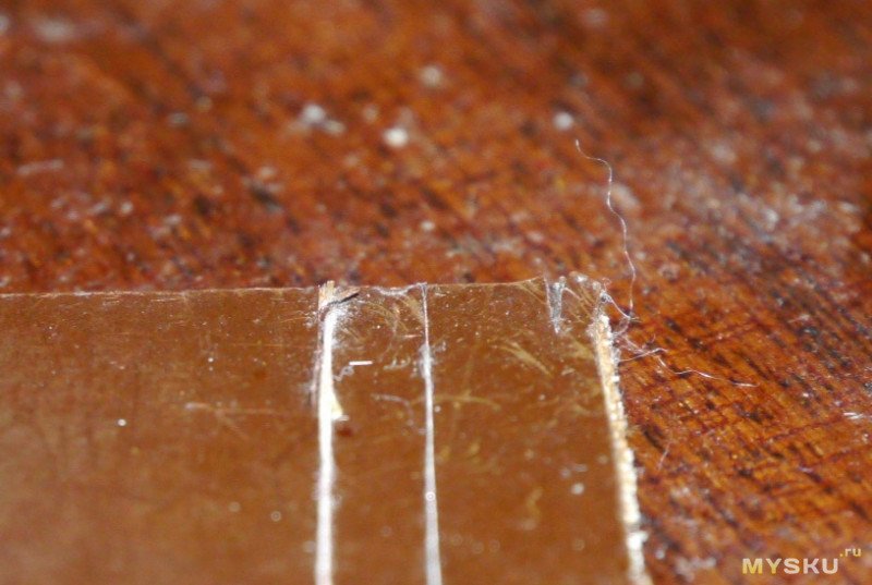 Вот, например, результат работы по стеклотекстолиту платы мышки. Разрез сделан в один заход с минимальными усилиями, словно скальпелем по картону.