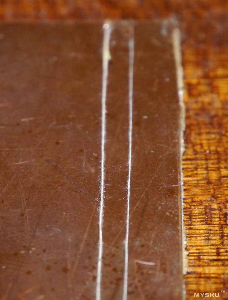 И несколько фото шлифовки. Хочется отметить, что шлифует нож очень мелко. Либо я пока не разобрался, как правильно им пользоваться, либо так и задумано. Даже царапины на медной пластине зашлифовать не получилось, не говоря уже о гравировке по стальной крышке.