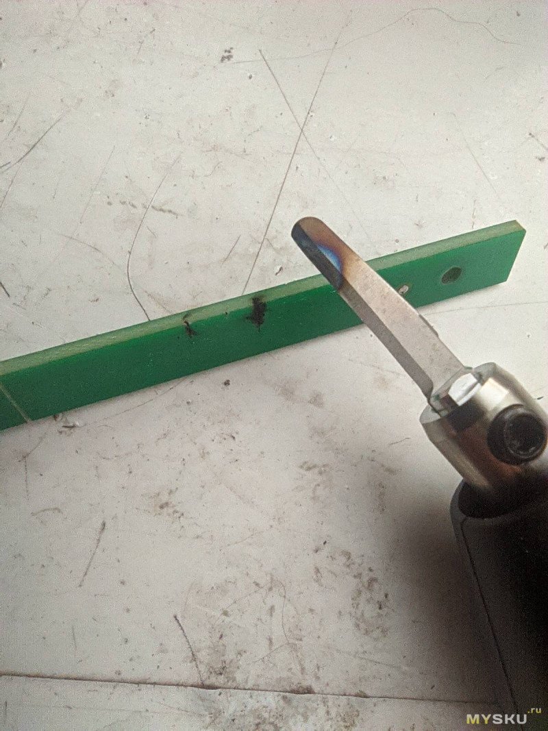 - Лезвие режет твёрдые материалы (пластик, текстолит, дерево, резину) с минимальными усилиями.