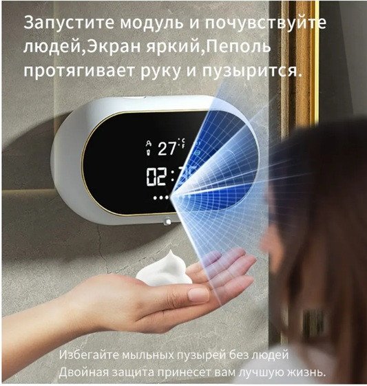 Прикольный диспенсер. Выглядит симпатично, дисплей загорается когда заходишь в ванную комнату, отображая текущее время и температуру. Датчик движения чувствительный, не приходится махать руками перед зеркалом. Нижний сенсор так же отрабатывает без нареканий с 6-10см. Мыло экономит прилично и аккумулятора хватает надолго.