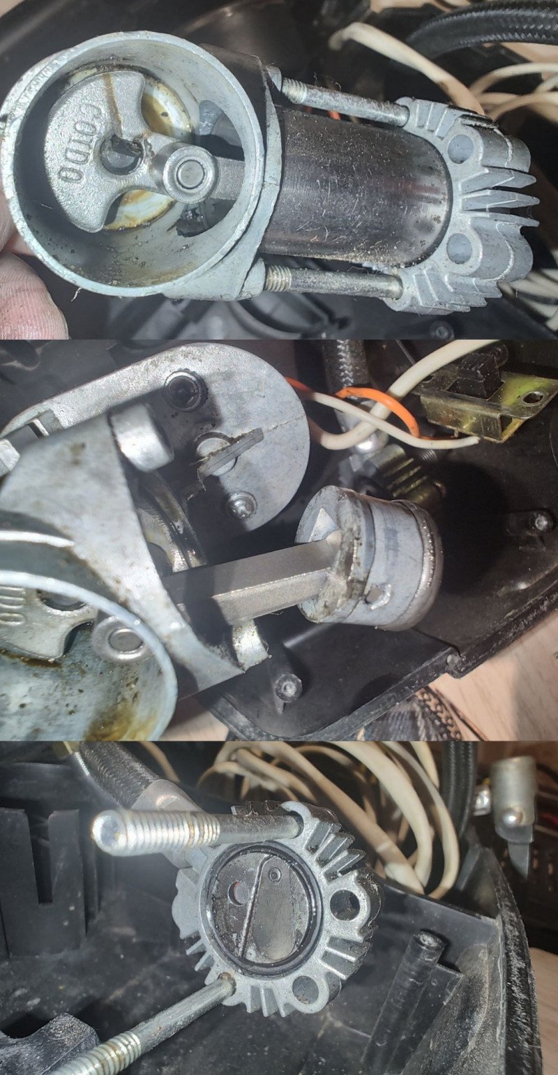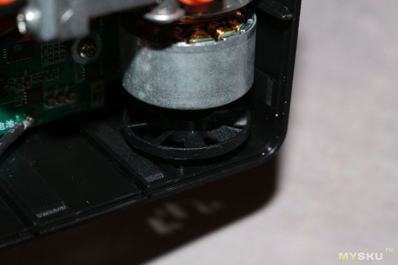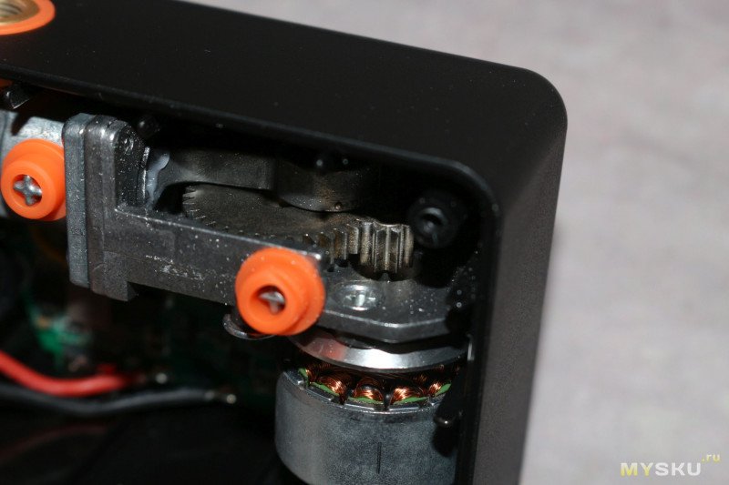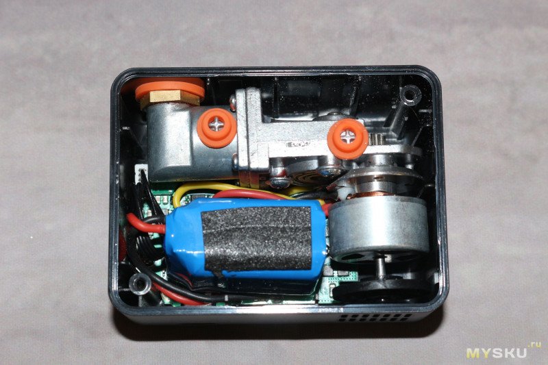 Задняя крышка на двух саморезах с шляпкой под торкс Т10 и не сильно упрямых защелках по периметру, а значит внутрь можно легко попасть. Там нас встречает бесколлекторый моторчик и изготовленный из металла компрессор. Передача усилия идет через металлические же шестерни. На валу мотора напротив отверстий в корпусе насоса установлена крыльчатка для охлаждения внутренностей.На корпусе компрессора есть штифты, на которые надеты силиконовые антивибрационные проставки — на задней крышке под них сделаны ответные выступы для фиксации.