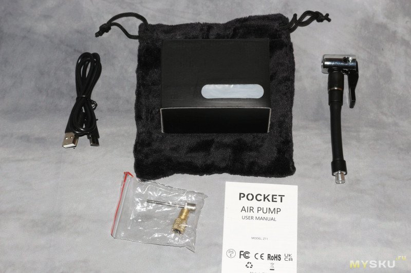 Сам насос упакован в дополнительную коробку меньшего размера. Остальной комплект — плюшевый мешочек, шланг длиной 9,5 см без учета зажима для нипеля, переходник на престу, игла для накачки мячей, зарядный шнурок Type-C.