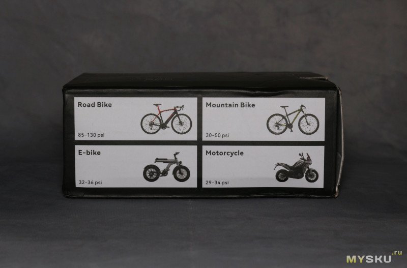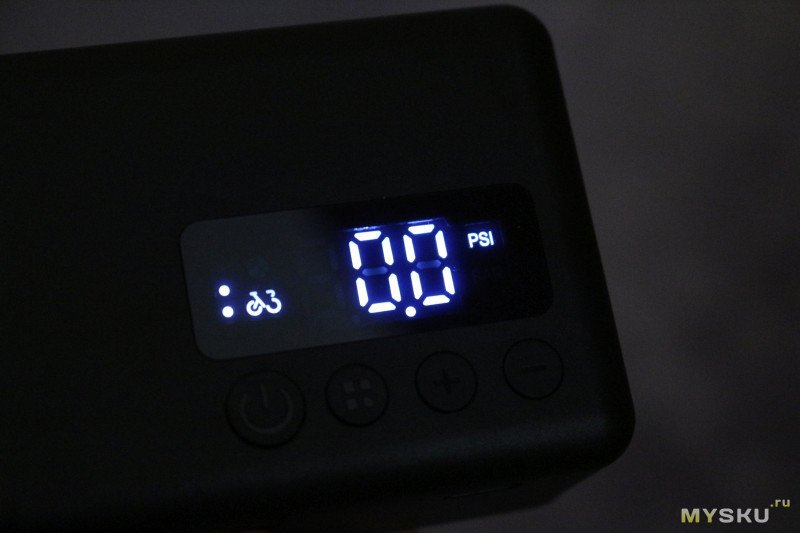Дисплей отображает минимально достаточную информацию — уровень заряда (его также можно узнать, когда насос выключен, по короткому нажатию на клавишу включения), выбраный режим работы (колесо велосипеда/мяч), и текущее значение давления (по длинному нажатию на кнопку меню можно выбрать PSI или Бары).