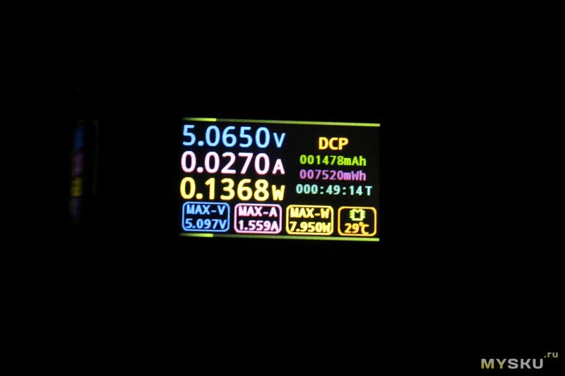 Заряжался он почти 50 минут, залилось 1478 мАч, что несколько меньше обещанных 2х800 мАч.