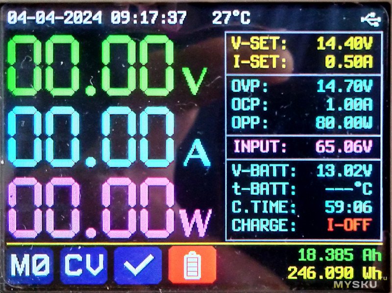 По результатам практических замеров напряжение, отображаемое на экране, в целом близко к реальному и особых вопросов не вызывает. А вот ток, отображаемый на экране зу имеет заметно выше фактического, реальный ток на аккумуляторе ниже примерно на 20–40% в зависимости от режима. Примечание: похоже, что это не ошибка измерений, а особенность логики отображения и зарядник показывает расчётное или целевое значение режима, а не точный мгновенный ток на клеммах.