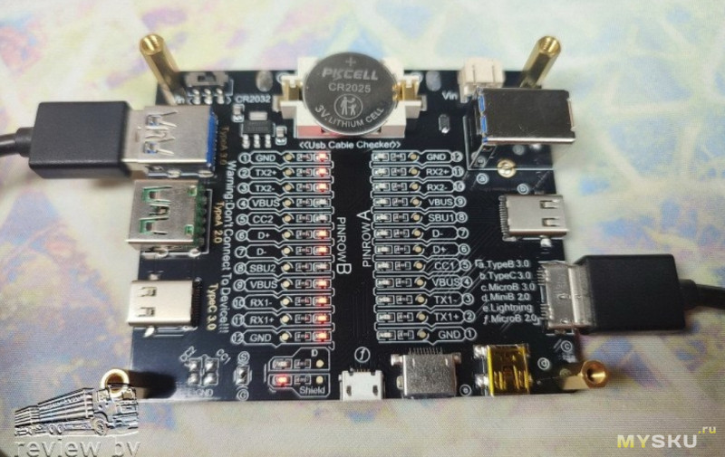 Плата позволяет проверить целостность всех сигнальных линий, питание VBUS, заземление, выявить обрывы или короткие замыкания. Для каждого пина предусмотрен отдельный светодиод-индикатор, благодаря чему процесс проверки максимально нагляден и не требует дополнительных инструментов.