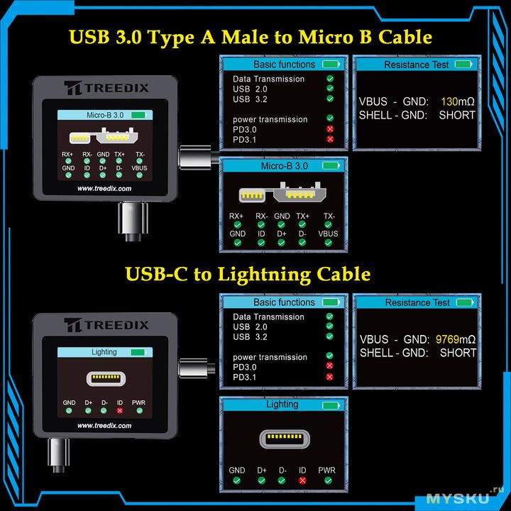 Тестировочная плата (USB Cable Tester Board) предназначена для быстрой и наглядной диагностики USB-кабелей всех популярных типов — от старых Mini-B и Micro-B до современных Type-C 3.2 и Lightning.