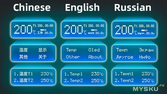 Другое — Buzzer (вкл/выкл); HeatTime (таймер автоматического отключения, OFF/1–60 мин); Power (Output power AUTO/20–100%); LowVolt (защита по низкому напряжению OFF/10.0–23.0V); FactorySet (сброс);