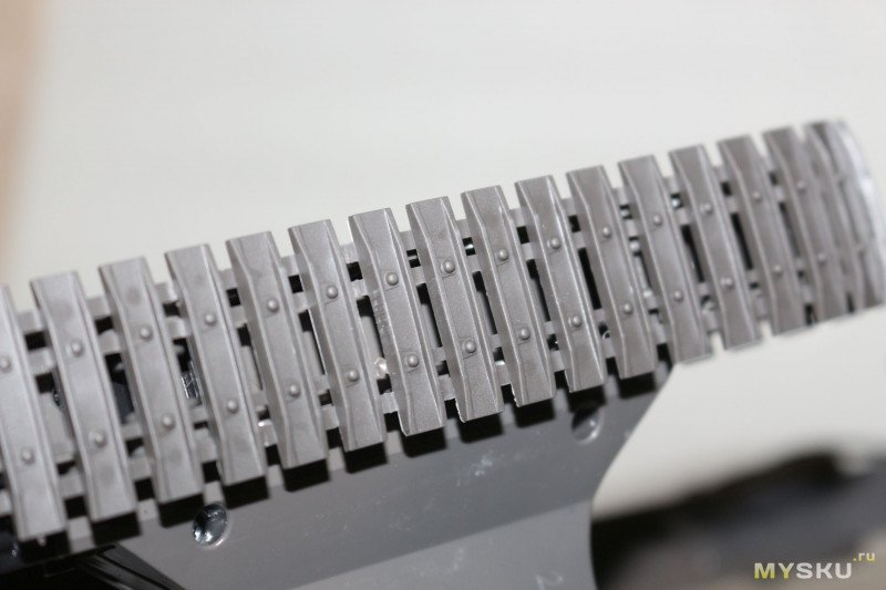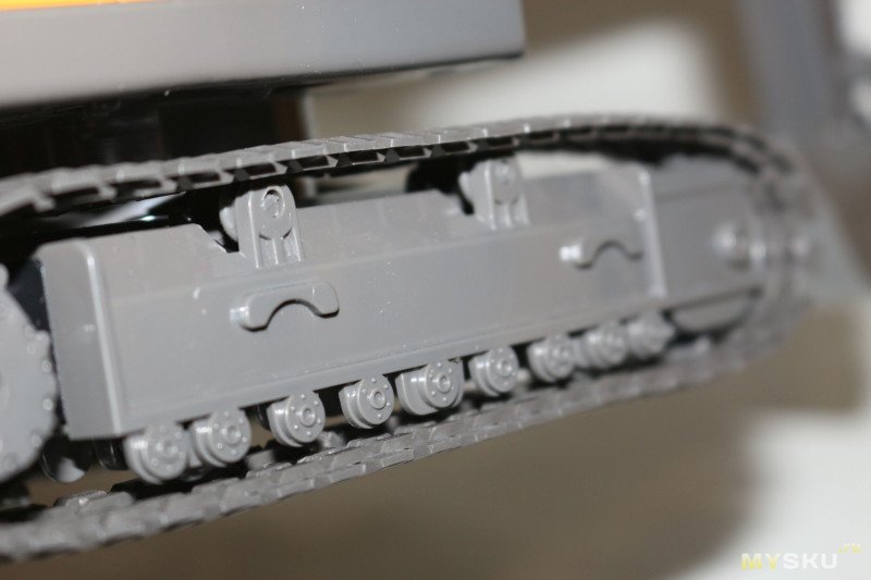 Гусеницы изготовлены из эластичного резиноподобного пластика. Зацепы, клепки, крепление опорных валиков также сымитированы, хотя в этом узле детализация и пониже.