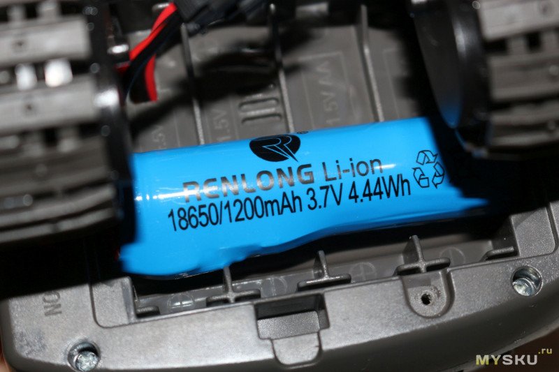 В нижней части моторного отсека находится аккумулятор. Видно, что изначально планировалось питание от 4хАА батареек, но в итоге поставили аккум 18650 емкостью 1200 мАч, которого хватает на 30-35 мин работы.
