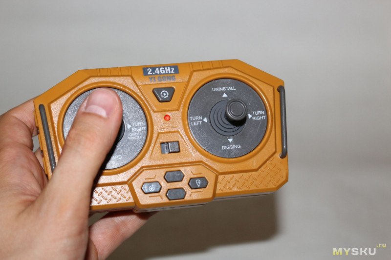 Пульт по размерам и форме такой же, как и у самосвала. Но органы управления другие — теперь это два джойстика. Левый отвечает за движение вперед/назад и разворот платформы с кабиной и ковшом. Правый управляет повороты гусениц и движение стрелы. Также есть кнопки включение/выключения света и звука двигателя и кнопка демонстрационного режима, когда экскаватор выполняет разные движения самостоятельно.