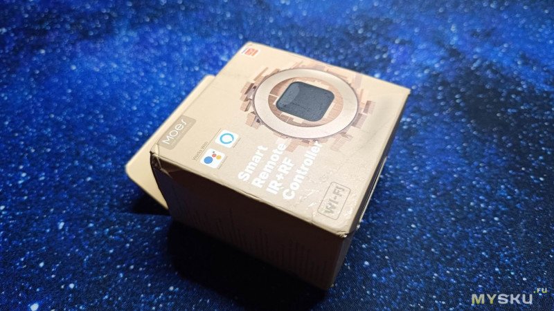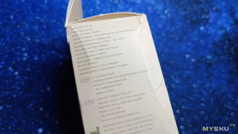 Поставляется пульт в небольшой коробочке из тонкого картона. На боковой стороне которой указаны характеристики устройства.