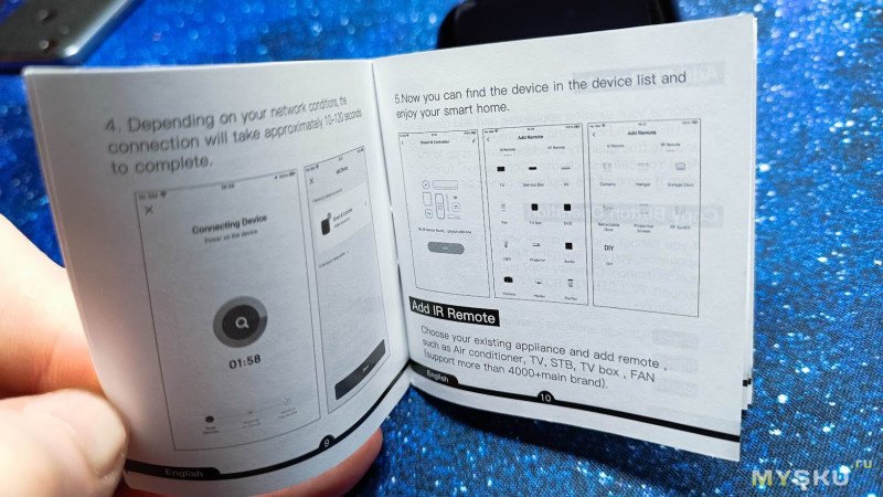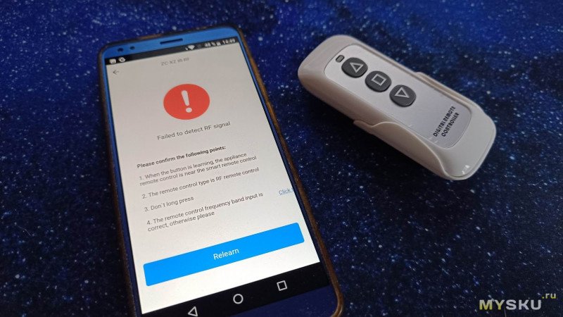 В приложении активируется некий радар, который начинает поиск устройств поблизости. Через несколько секунд пульт обнаруживается и подтягивается в приложение после выбора домашней WIFI сети и указания пароля. Последний скриншот не верен, пульт поддерживает только сети 2,4 ГГц, как впрочем и другие аналогичные устройства.