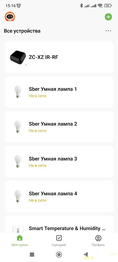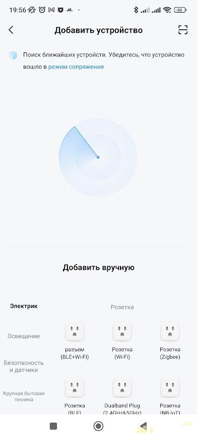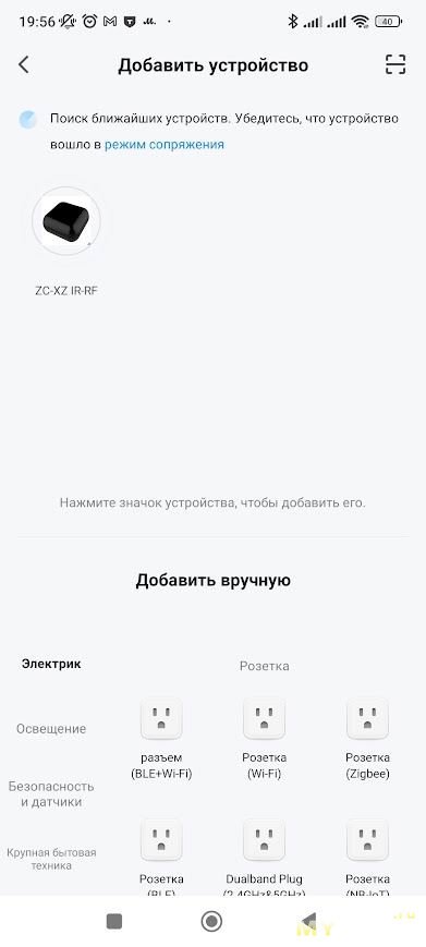 Тут мне всё уже знакомо. Нажимаем плюсик в правом верхнем углу для добавления нового устройства. Подключаем кабель питания к пульту и зажимаем кнопку на его дне.