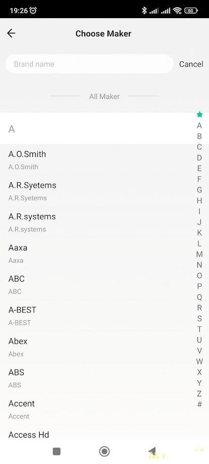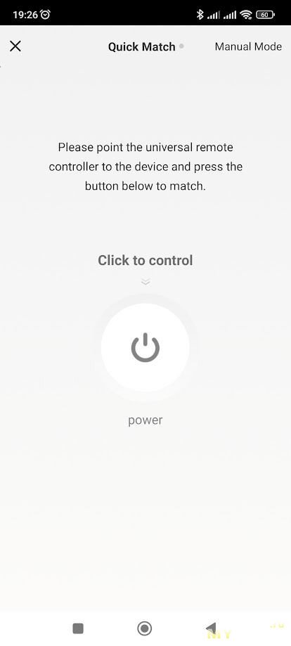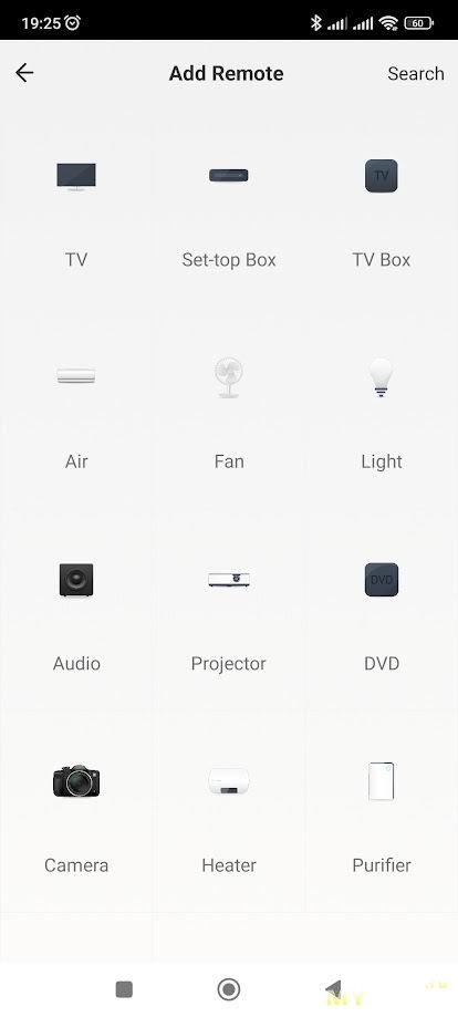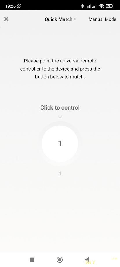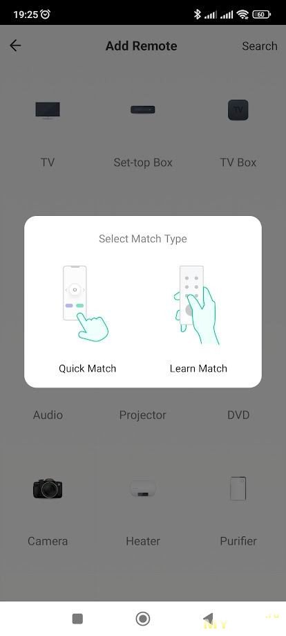 Для чистоты эксперимента проверим ещё работу пульта MOES с обучением на инфракрасных пультах. Мой телевизор, который управляется голосом через Broadlink, как-то коряво работает. При команде включить следующий канал, включает предыдущий и наоборот, путает нумерацию каналов и пр. Переобучим как раз его. Выбираем раздел IR устройства, ищем нужный тип — телевизор и попадаем в меню вида обучения — на шаблонах в приложении, либо копированием с пульта.