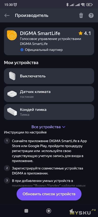 Однако моё ликование было недолгим. Несмотря на то, что список моих устройств пополнился экраном, управлять им Алиса наотрез отказывалась. Решил пойти другим путём — вернуться в рекомендованное для умного пульта приложение MOES и посмотреть список поддерживаемых Алисой устройств.