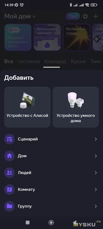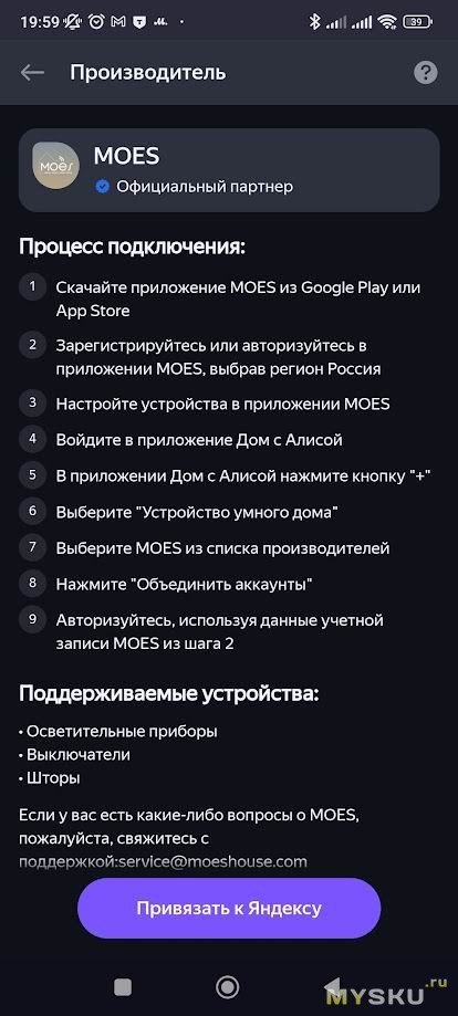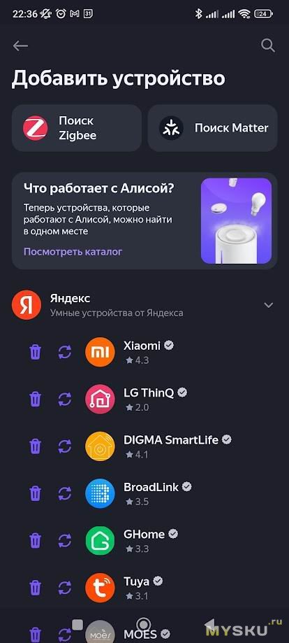Остаётся пустяк — добавить наши устройства в умный дом Яндекса, чтобы управлять ими голосом при помощи Яндекс-станции. Жмём на главном экране Умного дома Яндекса плюсик, выбираем пункт устройство умного дома и в списке партнёрских приложений ищем MOES.