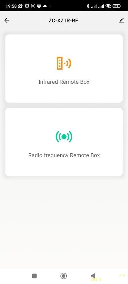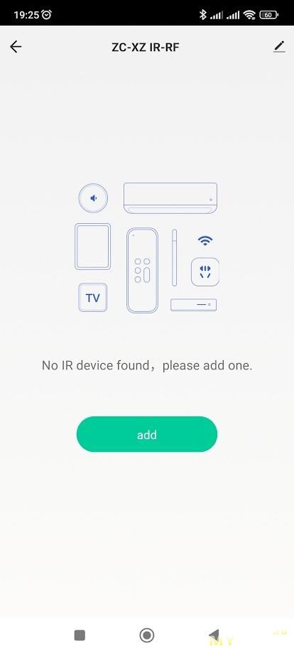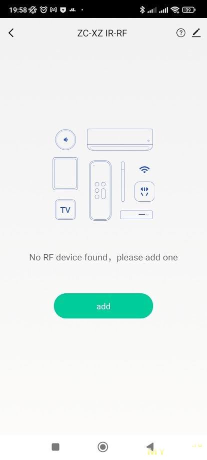 После чего перед нами открывается главный экран приложения, никаких устройств, кроме нашего пульта Moes UFO-R2-RF у нас пока нет, поэтому жмём на плюсик в правом верхнем углу и видим выбор из двух типов поддерживаемых устройств: инфракрасных и радио. Сейчас нас интересуют именно вторые.