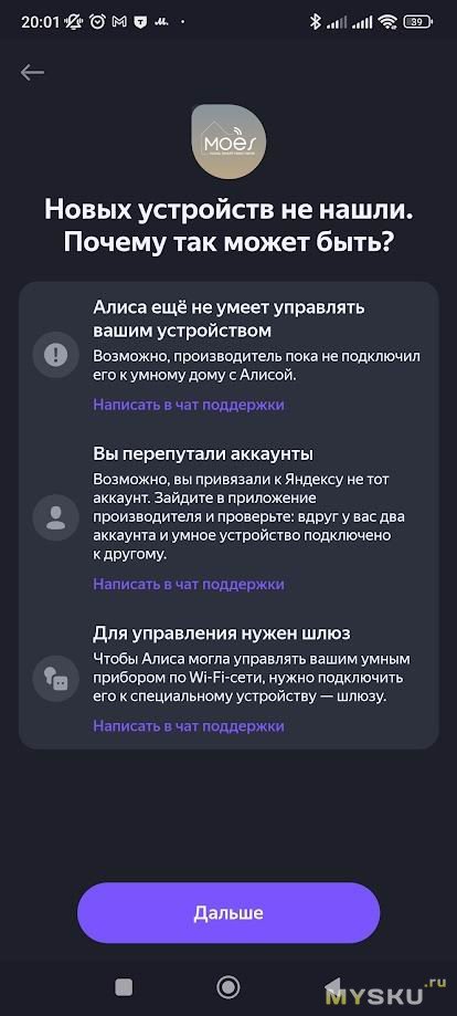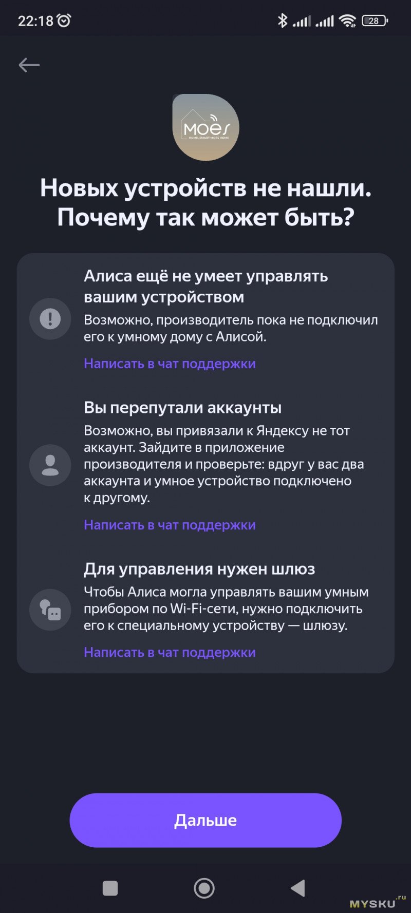По очереди обучил пульт от экрана каждой из этих категорий устройств, но Алиса упорно не желала их видеть. Ну что же. Это я тоже проходил с Broadlinkom — писал про неподдерживаемое устройство в тех. поддержку и через некоторое время его поддержка появлялась. Начал с саппорта Алисы, но наткнулся то ли на бестолкового оператора в чате, то ли на игнор. Буду пробовать через поддержку MOES.