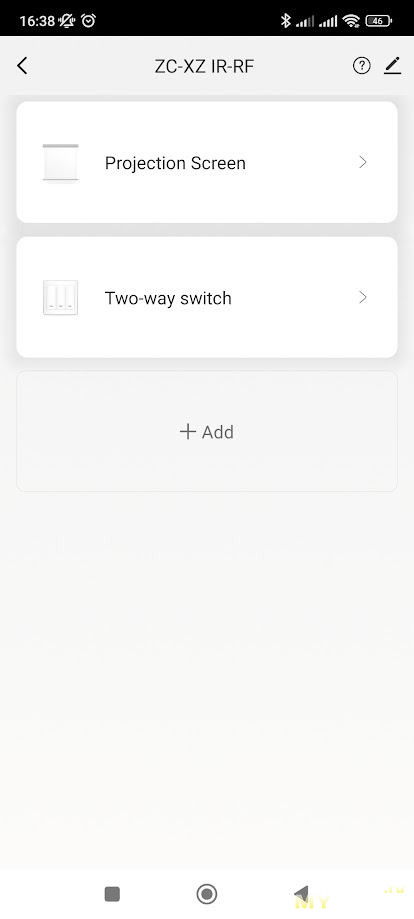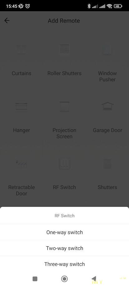 Жмём кнопку ADD и попадаем в меню выбора управляемых устройств. Нам нужны реле и проекционный экран. Реле нет, но есть выключатель на радиоуправлении — смысл один. Выбираем двухклавишный, чтобы можно было реализовать разные сценарии кнопок.