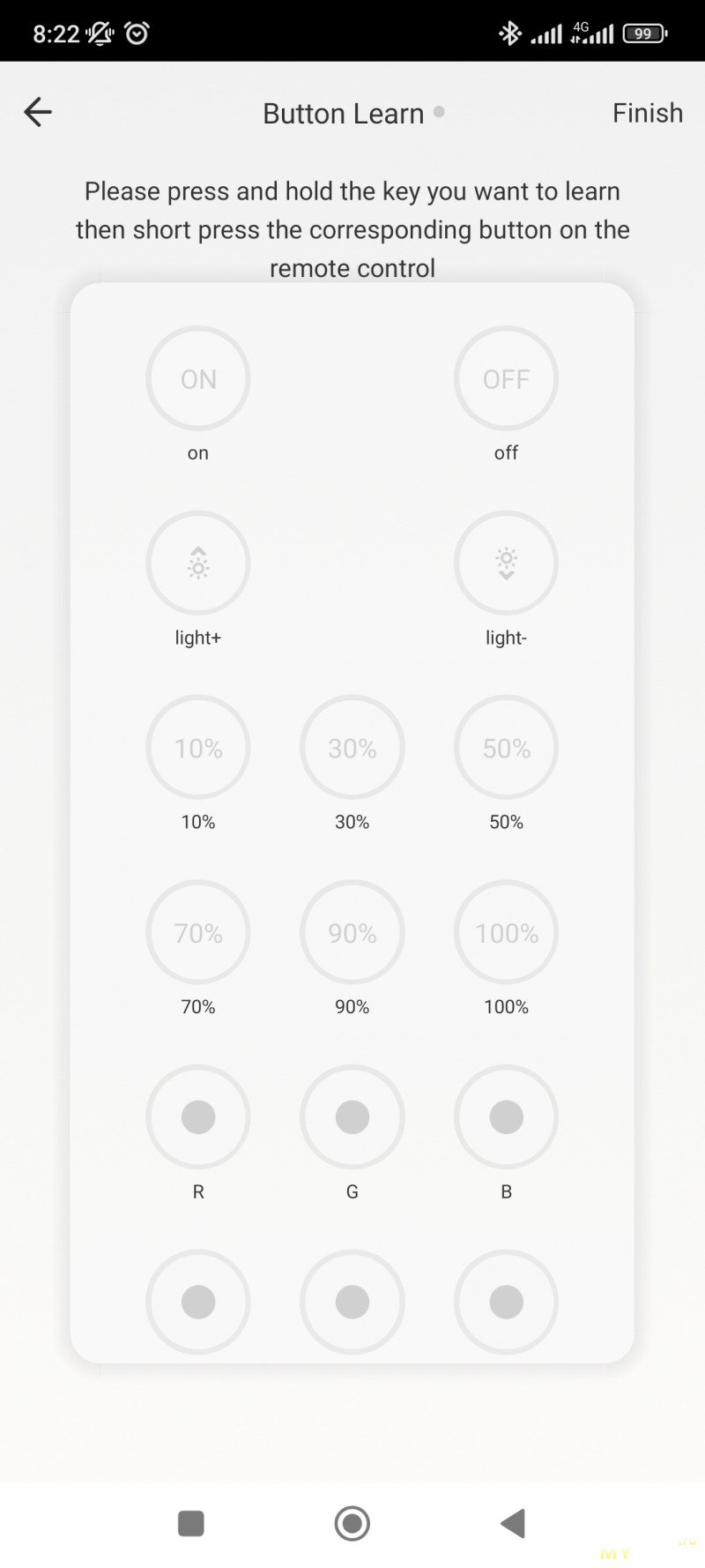 После чего нужно нажать и не отпускать выбранную кнопку на физическом пульте, таким образом происходит обучение умного пульта. Пока умный пульт учится, синий светодиод будет гореть.