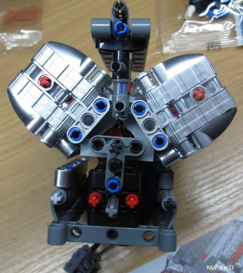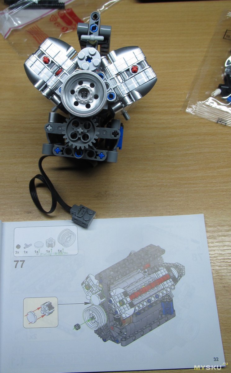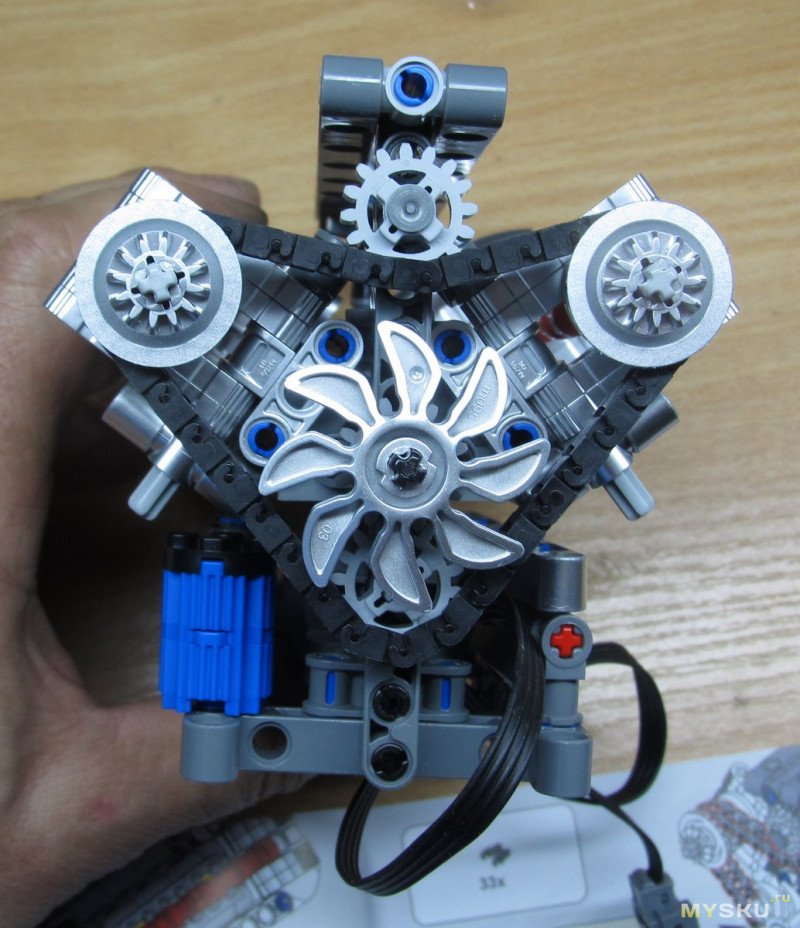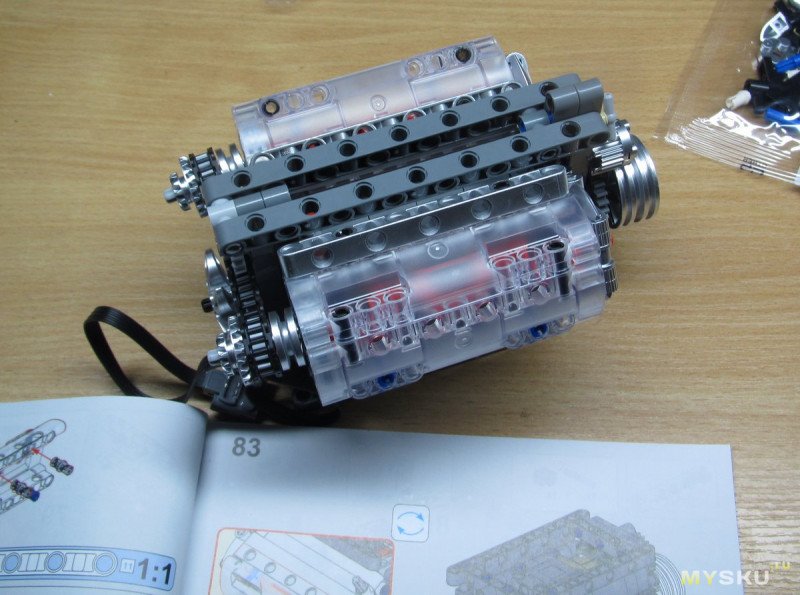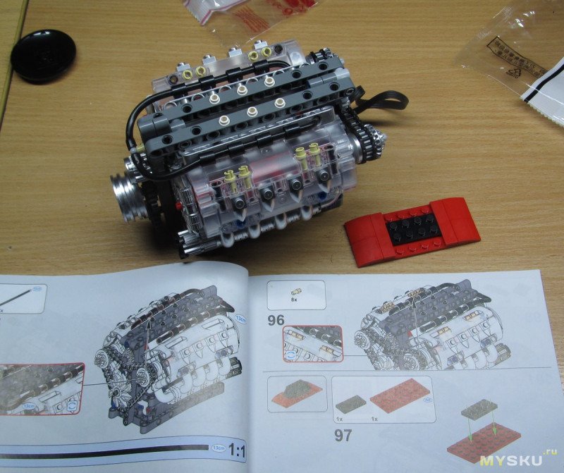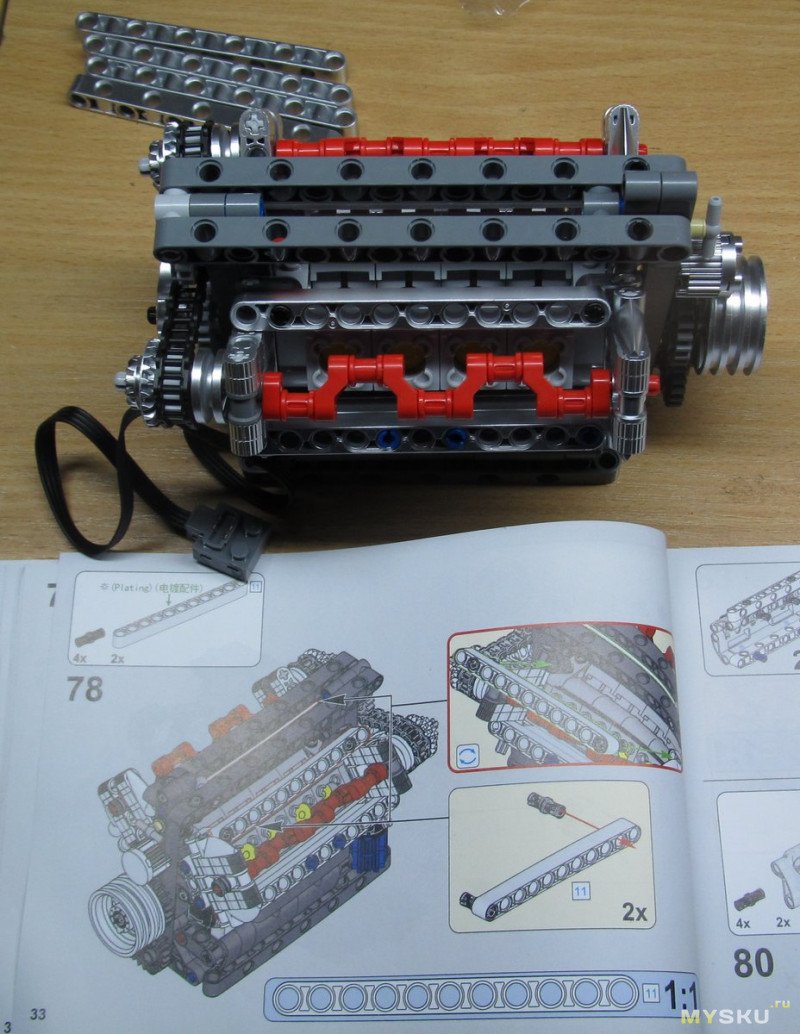 Ну и резюмируем. Шикарная игрушка для маленьких и не очень мальчиков. Мальчик Сирожа 50 годиков собирал сей конструктор порядка 3 часов, и даже почти не накосячил нигде. Распредвалы собрал изначально неправильно — недоставил по детальке, еще в одном или двух местах перепутал крашеную и некрашеную детальку — но это мой косяк по неопытности, ибо в мануале есть не только указание на то что деталь окрашена, но и размеры в виде картинки 1:1. Такие конструкторы это конечно скорее из разряда «сам себе не купишь — жаба задушит», но получить такое в подарок лично мне было бы чертовски приятно. Заявлено по возрасту 14+ и я б сказал что да, примерно так и должно быть, более молодые могут ниасилить. Собирать приятно и интересно, результат впечатляет и выглядит монументально. Разве что клапанные крышки недостаточно прозрачные — не видать что распредвалы крутятся и поршня ходят. Так что если у вас есть например знакомые мотористы с избытком свободного времени и подрастающим сыном, или просто сын/племянник увлекающийся конструкторами и техникой и желание купить не самый дешевый подарок — это отличный вариант.