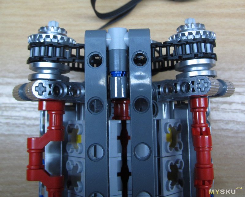 Собственно, писать тут особо и не о чем, ибо конструктор он и есть конструктор. В данном случае качество изготовления деталей просто отличное, всё соединяется чётко, рассоединяется с усилием достаточным для уверенного удержания в собранном виде и для разборки голыми руками. Ни одной бракованной детали, нигде ни облоя ни повреждения краски на окрашенных деталях — можно сказать что всё идеально. Единственный нюанс — я б положил на одно звено цепи больше, ну или изменил место установки натяжителя, потому что в текущем виде цепь получается перетянута и валы распредвалов аж немного изгибает. А, ну и второй нюанс — сами распредвалы чисто символические, и по конструкции похожи скорее на коленвалы, хотя можно было бы таки сделать пару новых деталей для большей «копийности».