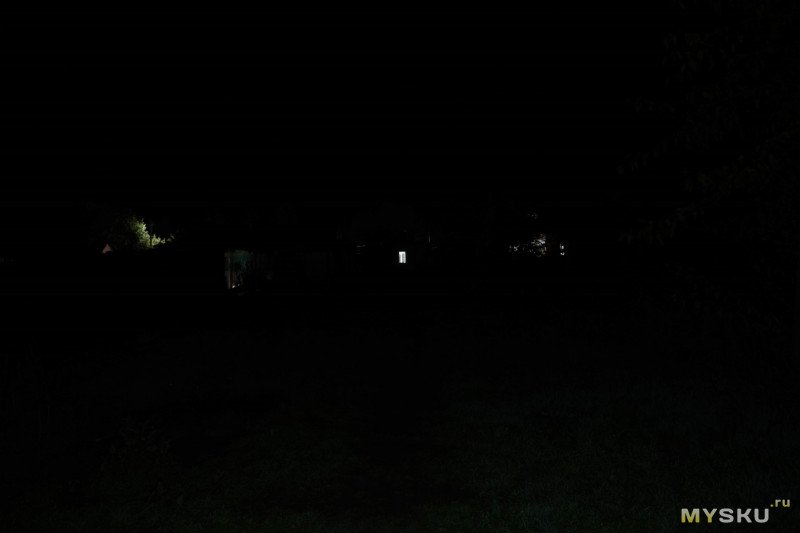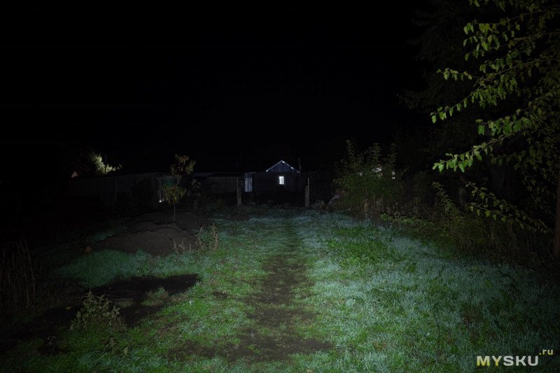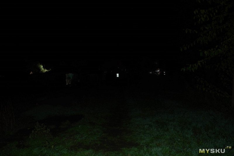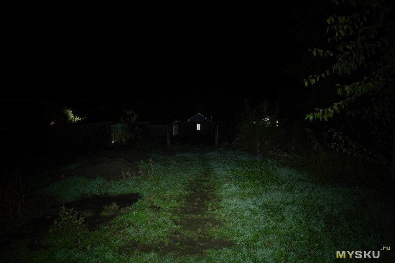Свет рассеянный, эффективная дальность освещения около 50 метров, т.к. пользователя будет слепить паразитная засветка. Если присмотреться, контрастные объекты можно заметить и на 80 метрах.