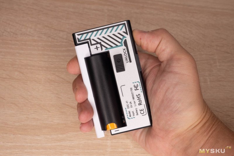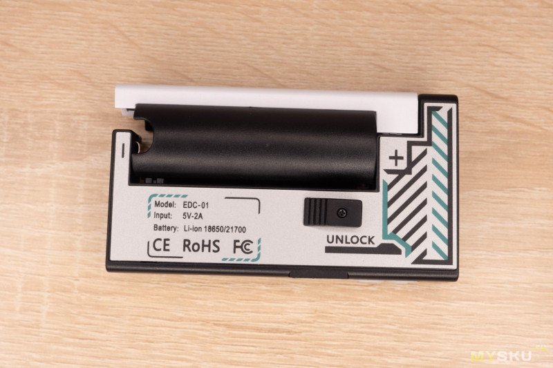 Для установки аккумулятора достаточно сдвинуть ползунок, вставить элемент и задвинуть конструкцию обратно до щелчка.