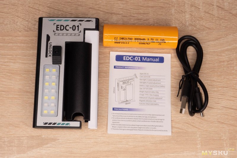 В комплекте фонарик, аккумулятор 21700 ёмкостью 3000мАч, кабель Type-C для зарядки и небольшая инструкция.