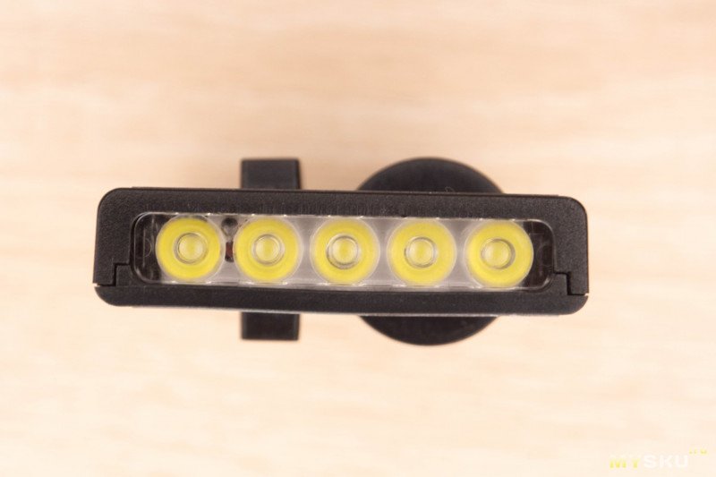 На переднем торце расположены пять диодов с TIR оптикой, с лицевой стороны находится окошко с дополнительными диодами для рассеянного освещения и красной/синей подсветкой. С обратной стороны написаны краткие характеристики. Ползунок открытия аккумуляторного отсека выведен с двух сторон.