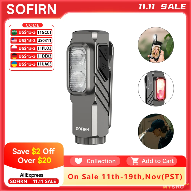 Компактный фонарик, металлический корпус которого напоминает другие копии найткор, но в данном случае излучатели добавили как на верхний торец, так и на лицевую сторону, что должно увеличить сценарии и удобство использования. Помимо красного светодиода имеется и УФ излучатель, при чем с рефлектором, увеличивающим дальность освещения.