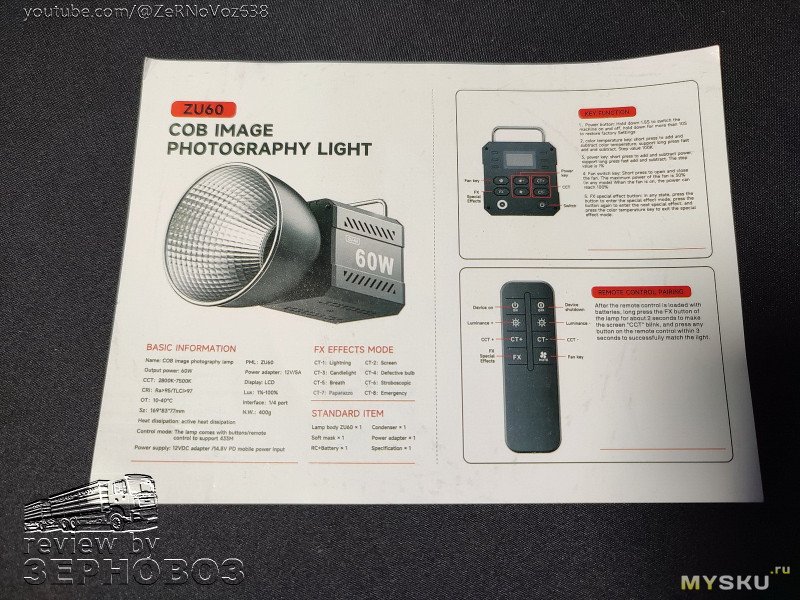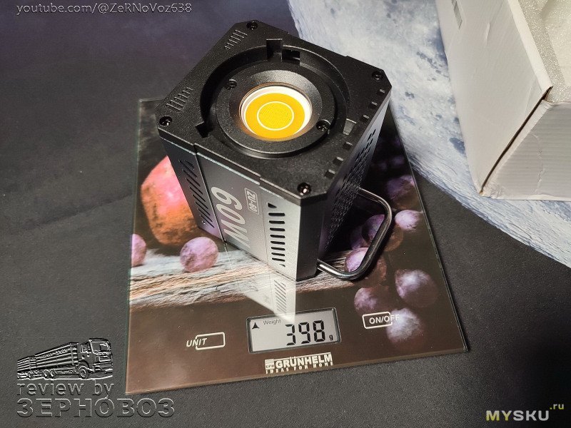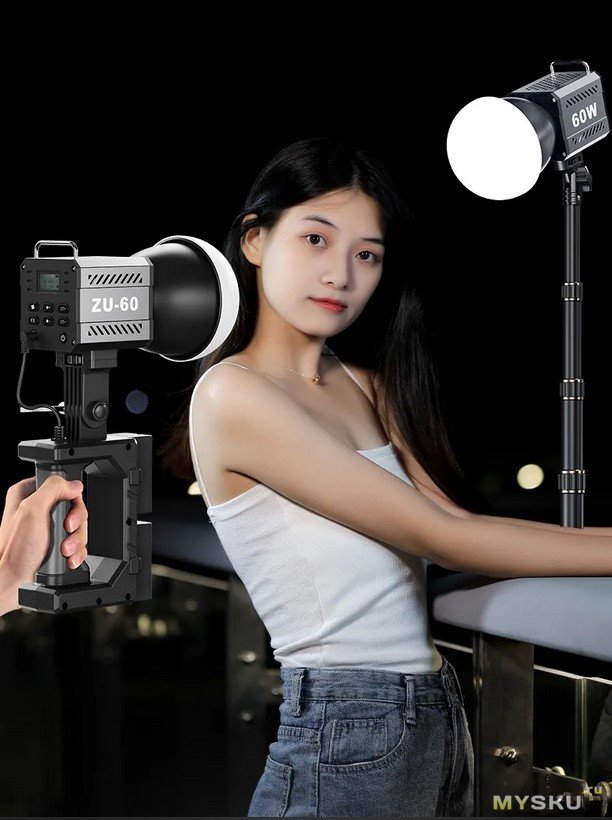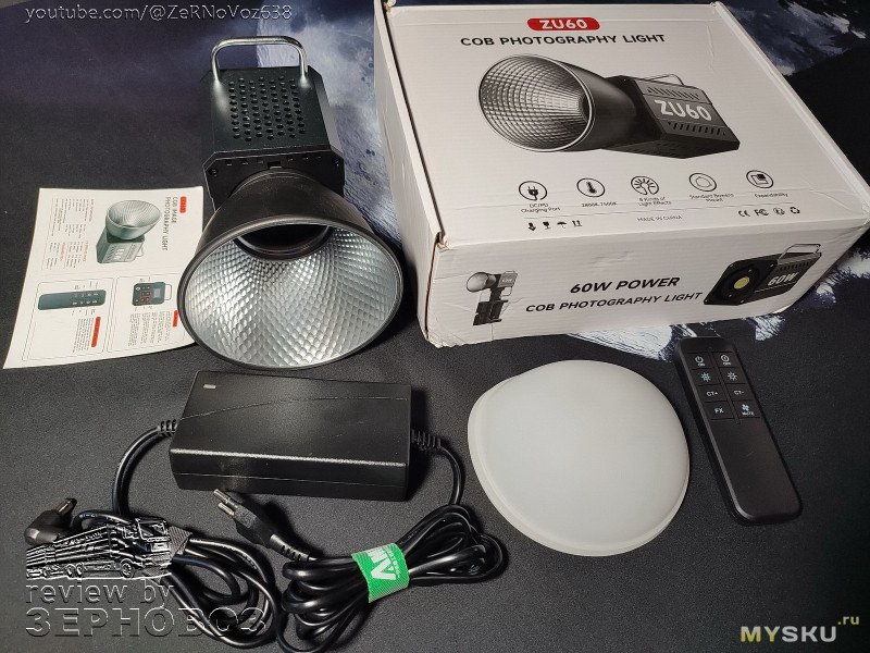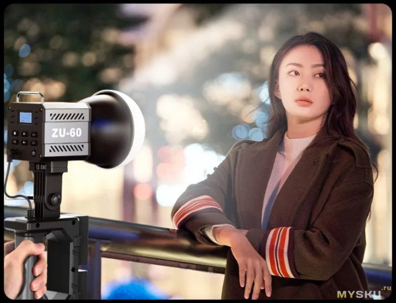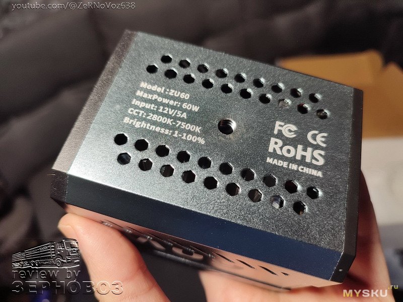 Что у нас сегодня? COB-свет ZU60 мощностью 60 Вт. Формально это ручной фото- видеосвет, а фактически довольно универсальный. Небольшой корпус, регулировка цветовой температуры от 2700 до 7500K, заявленный высокий CRI/TLCI и активное охлаждение. За свои 40$ пытается дать максимум яркости в мелких габаритах.